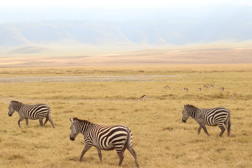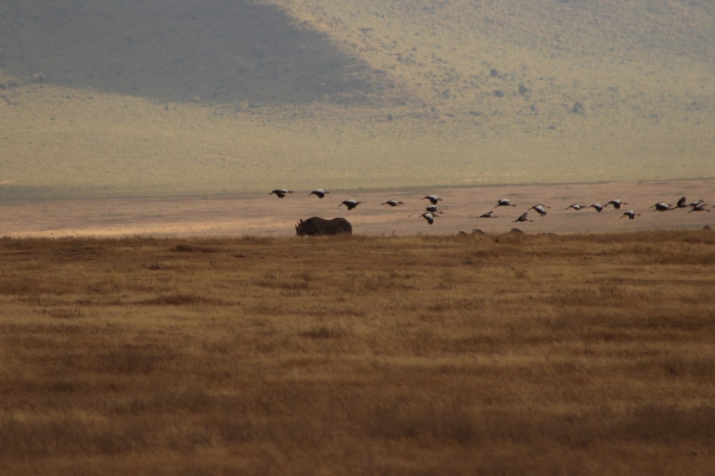 A 2.200 metri sul livello del mare. Un paesaggio che si estende a perdita d’occhio se osservato dall’alto, una scoperta continua se vissuto dal basso del letto del cratere. All’alba un leone e la sua leonessa. Lo sguardo di un ippopotamo e i piccoli che giocano. Le strisce tingono di bianco e nero i colori giallo e ocra del paesaggio. Sono solo 7 i rinoceronti nel cratere. Un elefante ci viene incontro.