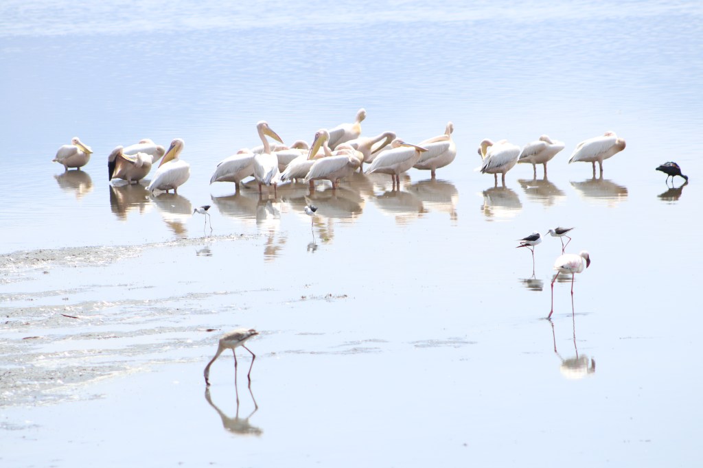Fauna e flora tutt’intorno ad un vasto specchio d’acqua poco profonda e ricca di alghe in cui gli uccelli dal becco largo e dal piumaggio rosa si specchiano e si tengono in equilibrio su una sola zampa.