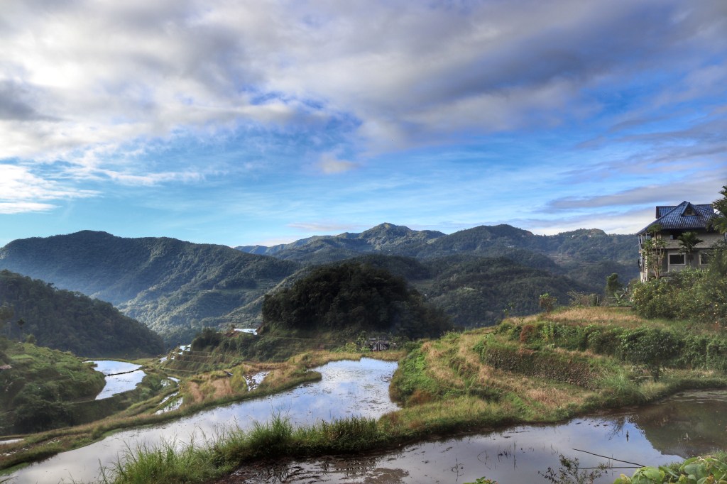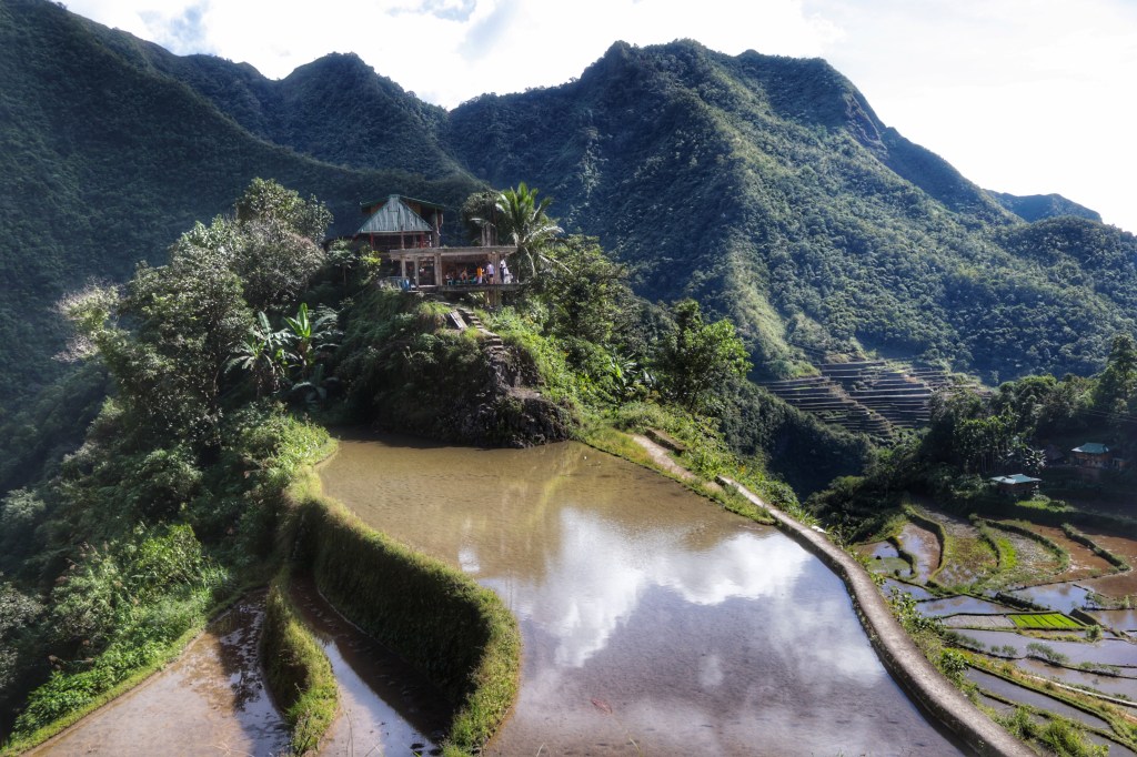 LE TERRAZZE DI RISO. Il giorno seguente ci aspetta un lungo viaggio a Nord dell’isola di Luzon. 7 ore circa di pulmino per raggiungere la provincia di Banaue-Ifugao, località in altura in prossimità dei terrazzamenti di riso patrimonio Unesco. In serata siamo al rifugio e la mattina seguente la nebbia si dirada lasciando spazio ad una bella giornata di sole durante il breve trekking che ci porta ad ammirare le risaie dal punto panoramico. Solo pochi terrazzamenti sono in coltura e la maggior parte sono in uno stadio primordiale della fase di raccolta, perciò spiccano i rari colori verde acceso e brilla il fango alla luce del giorno. Una coppia di anziani dai cappelli di paglia intrecciata e dai piedi sporchi è intenta a lavorare la terra. Hanno una scala per salire e scendere nei terrazzamenti. Noi seguiamo un tracciato sul confine di un terrazzamento e l’altro fino ad arrivare al punto più alto raggiungibile a piedi, unico modo di scalare i terrazzamenti, dove un piccolo totem raffigura il guardiano delle risaie. Si vede dall’alto il villaggio di Batad: casupole piccole e colorate e capanne in fondo ai terrazzamenti che scendono lungo la linea sinuosa della montagna. Arrivati in cima ci rimettiamo in cammino per riscendere, passando da una cascata, e tornare infine al punto di partenza. Nel paese ci sono molti negozi, soprattutto di artigianato e ci catturano nell’acquisto i bastoni di Mosè, bastoni di legno intagliato con una statuetta sull’estremità. Si torna in hotel a bordo di un pulmino, alcuni a sedere dentro, altri sul tettuccio. Non è raro vedere piccoli van sovraccarichi di passeggeri sfruttare anche il tettuccio per i bagagli, o per le persone. Non è ancora vigilia di Natale, ma si respira aria natalizia già alle 4 di mattina, quando ci svegliano dei canti e un forte odore di fritto proveniente dalla cucina. Nel paese c’è una chiesa, che è anche scuola per tutte le età, e una piazzetta, un mercatino, tanti sidecar. Per tornare a Manila serve un altro giorno di viaggio.