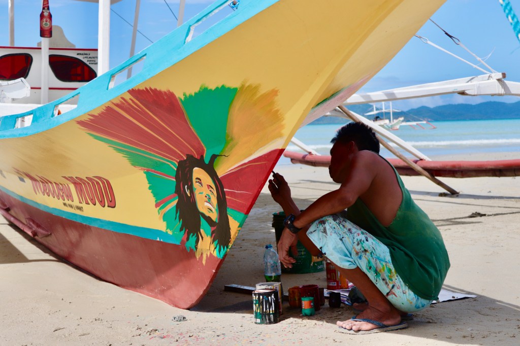 LA CODA DEL TIFONE. Nella notte un volo turbolento dall’aeroporto minore di Manila ci porta a Palawan la mattina presto. Viaggiamo all’alba e col sole fino a Puerto Princesa, località di mare oscurata improvvisamente dall’arrivo del maltempo, come annunciato nel giornale letto in hotel a Manila, per via del tifone in corso nel Nord di Luzon. Da questo momento in poi siamo isolati, per alcuni giorni, senza riuscire a usare la rete Wi-Fi o a contattare casa. Non ci sono televisioni e l’unico mezzo di informazione sono spesso i giornali. Il pomeriggio è grigio e la palma che piegata protende verso il mare è uno scatto tetro e suggestivo di una giornata tempestosa. Occasione per provare un massaggio completo della durata di un’ora. Le tende separano la zona per gli uomini da quella per le donne. Si può scegliere tra un massaggio dry oppure con dell’olio. C’è una lunga tradizione tramandata da generazioni sull’arte del massaggio, rispetto ai nostri standard decisamente anche molto economici, in genere sui 300 pesos, e senz’altro molto piacevoli. Al porto da cui partono le molte uscite in barca al fiume sotterraneo, attrazione principale del posto, i catamarani sono tutti rientrati e sono interrotte tutte le partenze. In questi casi si aspetta, che il tifone passi. Non c’è altro da fare, che aspettare. E qua ai tifoni ci sono abituati.