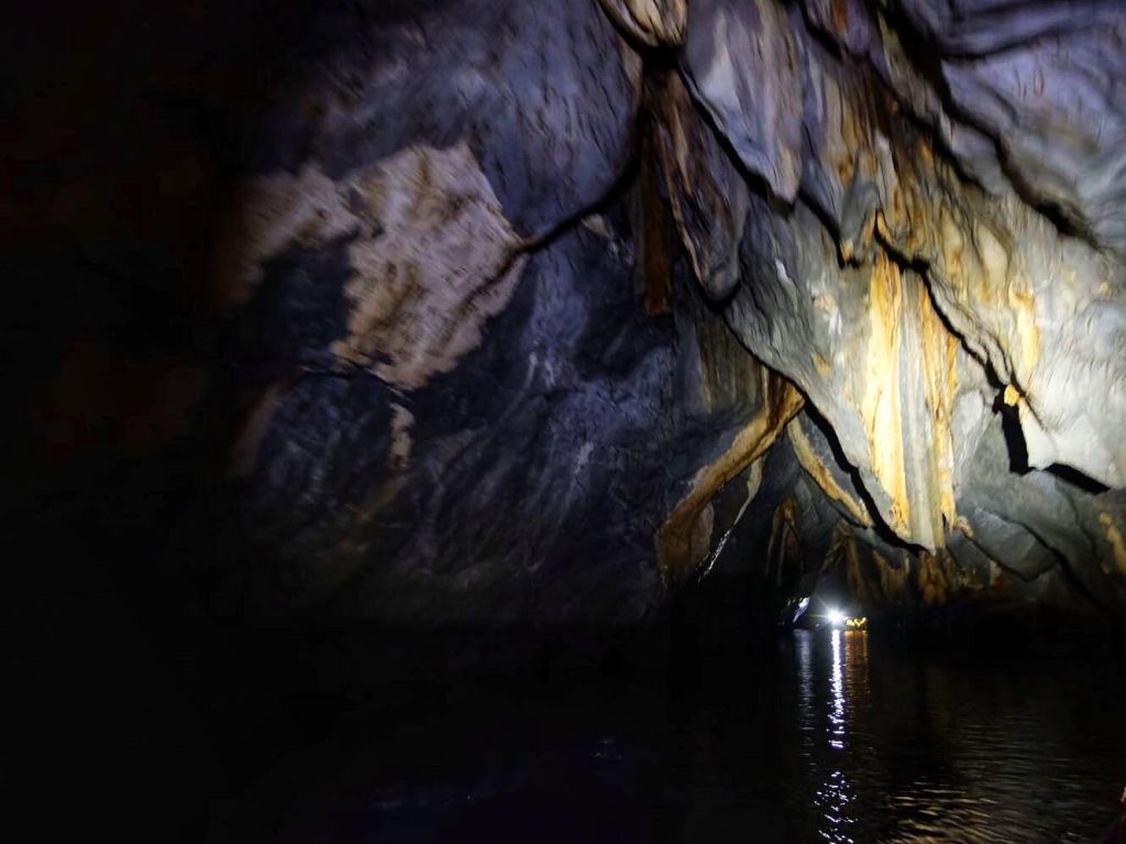 IL FIUME SOTTERRANEO. Il giorno seguente è bel tempo e tutto è tornato alla normalità. Da Puerto Princesa prendiamo un catamarano, barchetta in legno affusolata, con la poppa e la prua appuntite, e stretta con la capienza massima di due persone in larghezza e di 4 file da 2 in lunghezza e la stabilità dei bracci in bambù ai lati per solcare le onde. Il rumore frastornante del motore. Vale per le barche, per le motorini e per i van. Costeggiando un promontorio verde di vegetazione arriviamo ad una spiaggetta. Una scimmia e una via tra le palme conduce al fiume. La gita in barca inizia dentro il buio della grotta sotterranea. Una scultura naturale di stalagmiti e stalattiti dalle forme più bizzarre associate a figure umane, sacre, o verdure. La nostra guida pagaia e ci mostra le conformazioni rocciose con la torcia che porta sulla testa. Vivono in questo luogo sotterraneo scavato dall’acqua e dal tempo migliaia di pipistrelli. Volano schivandoci o dormono appesi.