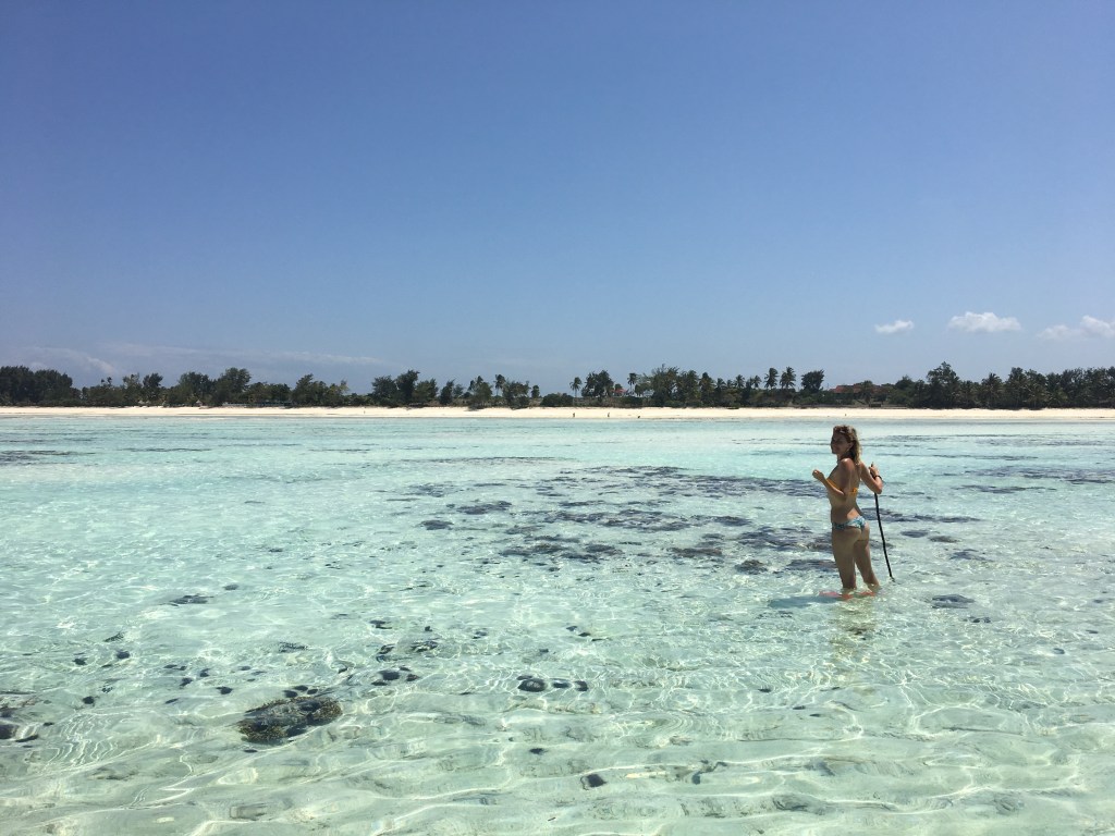 Passeggiando lungo mare uno di loro ci invita ad aggregarci alla pesca. Ci diamo appuntamento ad un dhow, una delle tante imbarcazioni in legno costruite dai pescatori dell’isola, ora con le scarpette da scoglio fornite dall’hotel ai piedi e lo seguiamo passo dopo passo schivando coralli e ricci, percorrendo circa 300 metri di distanza dalla costa, fino a voltarsi con gli occhi pieni dell’azzurro lieve del mare, dello stesso colore del cielo, interrotto in lontananza dalla sottile linea disegnata dalla sabbia bianca e dalle sagome delle palme. Dall’altra parte la marea consente di vedere i puntini dei pescatori che si sono avventurati più in là, con i loro sacchi carichi di prede e i loro bastoni affilati. Anche noi ne abbiamo uno ciascuno, come dei veri pescatori. Il ragazzo ne ha intagliati due prima di avventurarci a passeggiare in mezzo al mare, affilando con un coltello una delle estremità dei due rami. È un’emozione essere partecipi di questa routine così scontata per i locali e così rara per i turisti. Non è una di quelle escursioni organizzate e sono preziosi per noi i ricordi di questo incontro.