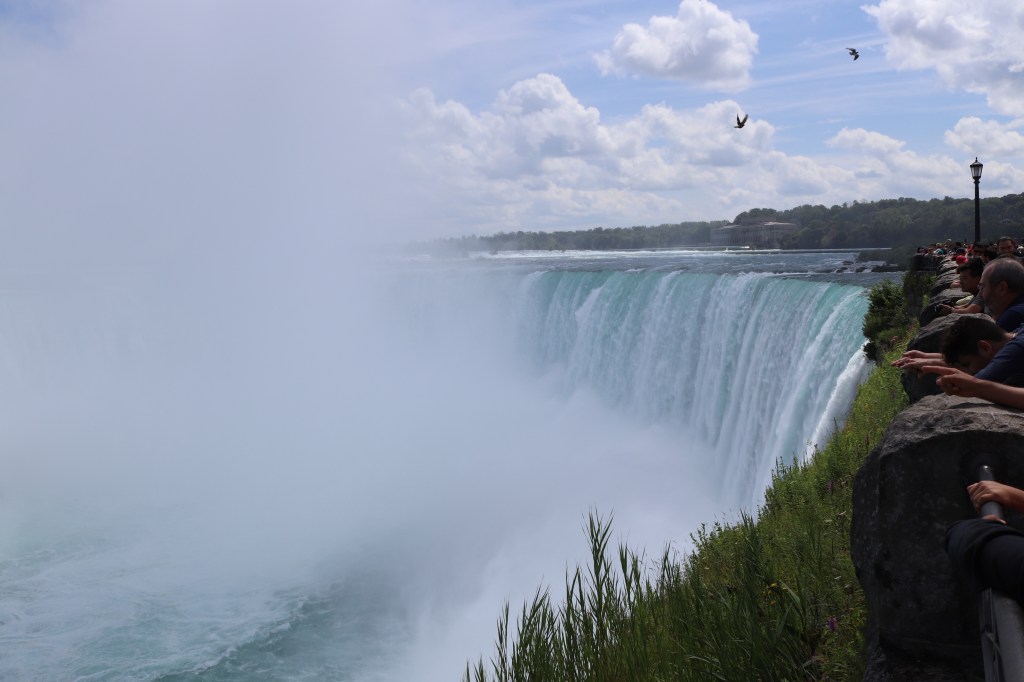 Le cascate del Niagara segnano il confine tra USA e Canada. Il lato canadese offre la vista più spettacolare. È quella che guarda verso la parte americana delle cascate. La location è ben attrezzata di ristoranti e hotel. All’arrivo si acquista il biglietto di ingresso. Abbiamo scelto un pass all-inclusive, comprensivo di vari percorsi per ammirare la furia dell’acqua da vari punti di osservazione: dalla terrazza panoramica, dalla grotta sotterranea, e in nave. Dall’alto le cascate cadono a strapiombo. In crociera ci si avvicina finché la vista non è annebbiata dagli schizzi e l’aria non si fa bianca di schiuma e vapore. Ai turisti vengono forniti sacchi di plastica per non bagnarsi. Comunque, qualche schizzo d’acqua non fa male nel caldo estivo. Senza questi simpatici sacchi di plastica con tanto di cappuccio saremmo completamente fradici dall’acqua nebulizzata. Un tunnel sotterraneo conduce alla vista più spettacolare delle cascate, quando possiamo ammirarle da sotto, vedendo l’acqua che cade con forza.