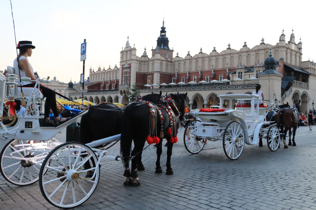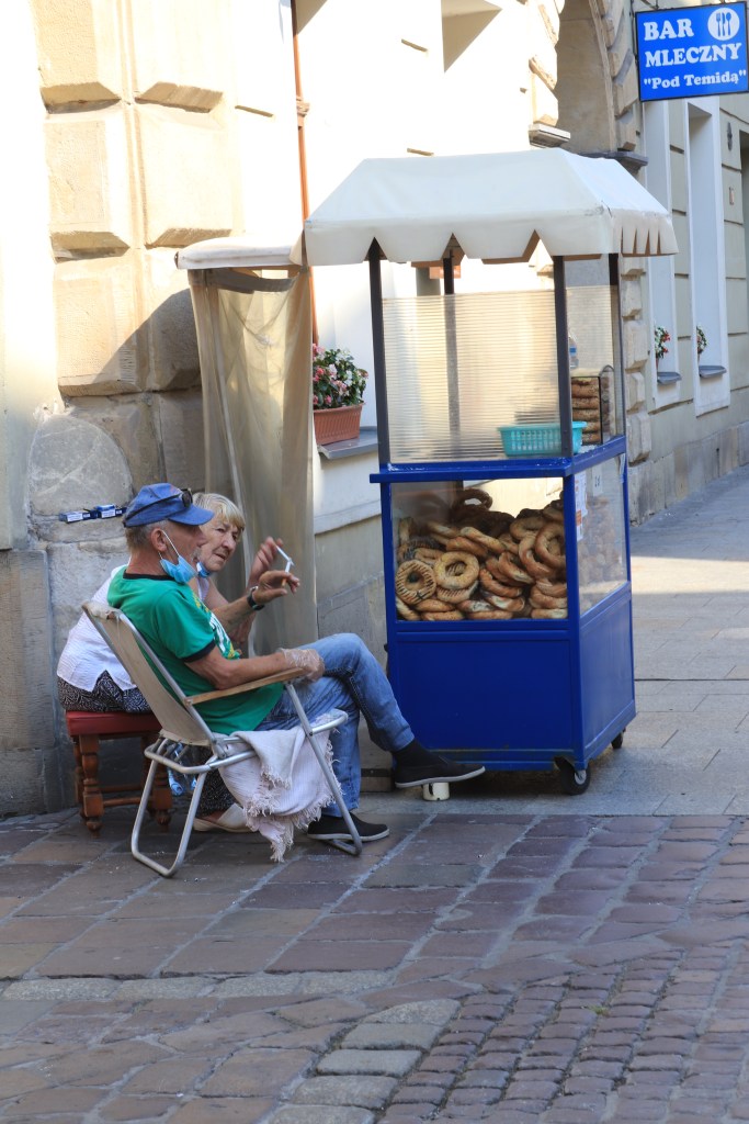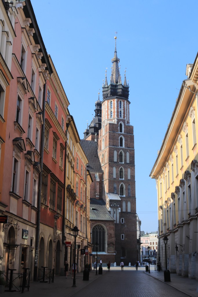 La mattina presto la via che porta alla Basilica di Santa Maria è semi-deserta. Sulla strada sbarrata al traffico, fatta di pietre e lampioni e case dalle facciate variopinte, sono già pronti i venditori di obwarzanek, le ciambelle di cui le piccole bancarelle ambulanti di vetro con le ruote e il tettuccio parasole sono già stracolme. Qualcuno è in bici, qualche carrozza bianca è già pronta con i cavalli imbrigliati e curati in ogni dettaglio, in attesa dei primi visitatori.