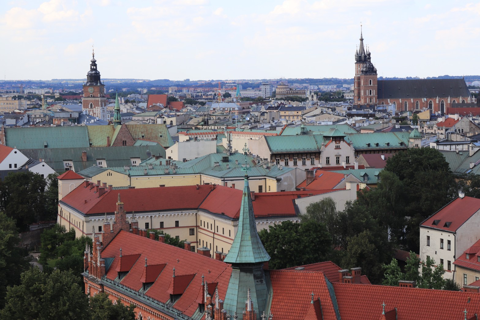 Arriviamo nel tardo pomeriggio, ma ancora con la luce del giorno. Volo in perfetto orario. E già questa è una soddisfazione, consapevoli dell’azzardo della nostra prenotazione avvenuta tre giorni prima della partenza, controllando le restrizioni anti-Covid e le offerte migliori su Skyscanner. Con circa 30 euro a persona abbiamo comprato la tratta dall’Italia alla Polonia. Poi con circa 50 euro a persona, incluso un bel bagaglio da stiva per i vestiti invernali, abbiamo comprato la tratta da qui alla Norvegia del Nord. Più o meno abbiamo speso le stesse cifre per i voli di ritorno, ma passando per Danzica. Grazie ad un pizzico di follia e ad una buona dose di fortuna è andato tutto bene. E sebbene per pochi giorni, le città meno conosciute della Polonia, rispetto alla meta più gettonata e capitale Varsavia, ci hanno incredibilmente affascinato. Un Uber, o in alternativa uno dei taxi in fila, da prendere appena usciti dagli arrivi, sono soluzioni celeri, eppur molto economiche, per raggiungere il centro storico dall’Aeroporto Internazionale Cracovia-Balice Giovanni Paolo II, in circa quaranta minuti di auto (per soli 35 zloty, che corrispondono più o meno a 8 euro). Anche l’autista ci accoglie con simpatia alla notizia di essere italiani. Nessuna discriminazione causa Covid-19 e allarmismo mediatico, ma rispetto e ordine nell’uso di mascherina e nella pratica del distanziamento sociale. Il nostro hotel è situato nel centro, all’inizio della via che va verso la Basilica di Santa Maria e il centro storico. A Cracovia ci si può permettere il lusso con una spesa modica. Il nostro albergo, con tappeto rosso e quadri d’epoca, si trova proprio davanti alla Porta di San Floriano, l’inconfondibile torre gotica dal tetto in granito rosso che contraddistingue l’architettura polacca, un tempo fortificazione costruita per proteggere la città dagli attacchi dei turchi. La finestra della nostra camera, in stile neo-classico, si affaccia sulla via che porta alla Basilica di Santa Maria e alla Piazza del Mercato, il centro storico e punto nevralgico della città. A pochi metri, nel Museo Czartoryski si può vedere il celebre dipinto di Leonardo, La Dama con L’Ermellino. Su Booking.com avrete l’imbarazzo della scelta per hotel moderni o più classici in posizioni comode e sempre a buon prezzo. Al tramonto passeggiamo verso la piazza principale, la Piazza del Mercato, con le carrozze bianche da fiaba in attesa di portare turisti e visitatori. I bar sono aperti e pieni di gente e la birra alla spina in Polonia scorre a fiumi. A cena ci sono molti locali tipici di specialità polacche da scegliere fidandosi delle recensioni positive in TripAdvisor. Morskie Oko è poco distante dalla piazza. La cameriera in abiti tradizionali ci porta all’interno. Si mangia nel sottoscala, una meravigliosa sala dalle mura in pietra adornate in ogni angolo, con un mulino, un camino e un’atmosfera talmente calda ed accogliente che sembra Natale anche in pieno agosto. Una band di archi suona in sottofondo musica dal vivo dalle note vivaci. Ci sono tavoloni in legno e i piatti sono abbondanti. Il bigos (stufato di carne con patate) è una specialità, insieme ai piroghi (ravioli ripieni di carne o formaggio), le zuppe e vari piatti a base di carne con contorni di verdure in agrodolce. Di sicuro ci si alza da tavola soddisfatti quando le porzioni sono così generose. Passeggiando per le vie del centro, la sera ci sorprende un acquazzone, ma la mattina seguente è il cielo è limpido e la temperatura è perfetta per visitare Cracovia sotto il sole, senza esser mai troppo caldo per fare i turisti d’estate.