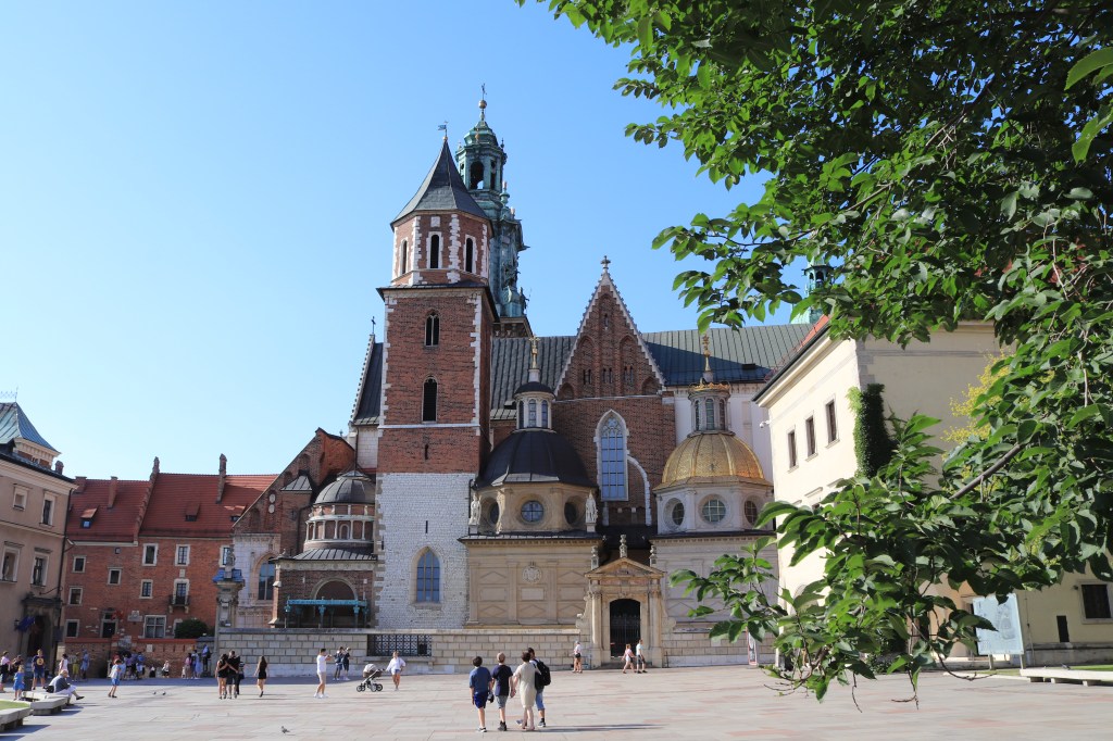 Sempre a piedi arriviamo al Castello del Wawel, simbolo storico e leggendario. Si narra che fu costruito sulla caverna in cui visse un drago sputafuoco (Smok Wawelski), di cui conserva la memoria una statua lungo il fiume. Qui visitiamo la Cattedrale gotica. L’architettura di questo luogo, dalla piazza, alla vista panoramica dalla torre, rispecchia in ogni angolo la tradizione architettonica polacca: palazzoni in mattoni rossi, torri dalle forme slanciate verso l’alto e tetti a spiovente in granito, mentre il Wavel è un insieme di stili architettonici, dal romanico al gotico, dal rinascimentale al barocco, lo sfarzo delle chiesa decorata d’oro fuori, pura di bianco intonaco con quadri e vetrate di raffigurazioni sacre dentro, e il Castello reale protetto dalle mura difensive. C’è tutto il tempo per rilassarsi prendendo un caffè ad un bar della piazza e poi passeggiare lungo il fiume Vistola, dove corrono i monopattini elettrici, usati da molti giovani e prenotabili con app.