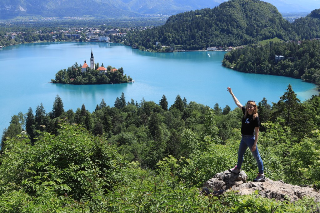Dai boschi nei dintorni si può raggiungere il punto panoramico più spettacolare. Mettere in Google Maps Ojstrica viewpoint e addentratevi nei boschi, fino a vedere l’isolotto come fosse soltanto un puntino lontano in mezzo al lago, tutti i confini di Bled, il castello e le montagne di contorno. Il trekking non è impegnativo e la vista si raggiunge anche senza Maps una volta imboccata la giusta via, seguendo le indicazioni del percorso sugli alberi e le rocce. Da qui consiglierei la migliore foto ricordo.