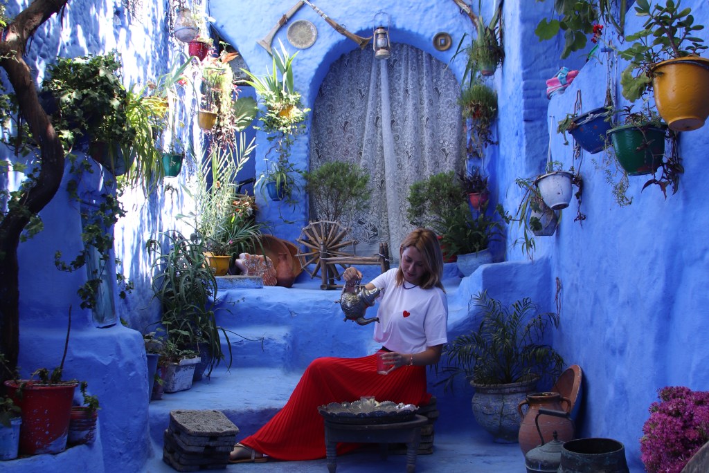 CHEFCHAOUEN – Questo villaggio di montagna dalla pronuncia impegnativa si trova sotto le cime del Rif. Famoso per il colore acceso con cui sono verniciati tutti i muri delle vie del centro, ma anche le case e i negozi, le strade e le scale, colpisce per il suo carattere pittoresco, ma allo stesso tempo autentico. Alcuni vicoli sono spogli, ornati solo di azzurro e bianco, altri sono decorati da piccoli vasi gialli o rossi e piantine, altri ancora strabordano di borsette in pelle, babucce, tappeti e foulard variopinti; molti sono gli artigiani e i sarti del Marocco, altrettanti i venditori ambulanti e i negozianti. Sempre sullo sfondo, di ogni vicolo, in ogni angolo, o via principale, il suo colore predominante, tanto da valergli la nomina di “perla blu del Marocco”. Se non si è accompagnati, qui è comunque bello, e neppure rischioso, perdersi tra le viuzze, dove si incontrano le influenze architettoniche marocchina e spagnola. La piazza al centro è un ottimo riferimento. Al mattino presto gironzoliamo prima della luce accecante del mezzogiorno, per curiosare ovunque nella medina, in cerca di scorci caratteristici, trovati con facilità un po’ in ogni dove. Ci facciamo accompagnare dal receptionist dell’hotel, Youssef. Ci tratta come un caro amico, portandoci nei luoghi segreti e più instagrammabili della città. Qui è davvero impossibile smettere di fotografare. Nel primo pomeriggio, sazi di blu, azzurro, celeste, dei giochi di ombre e luce del sole a picco dell’estate e dell’Africa, ripartiamo in van.