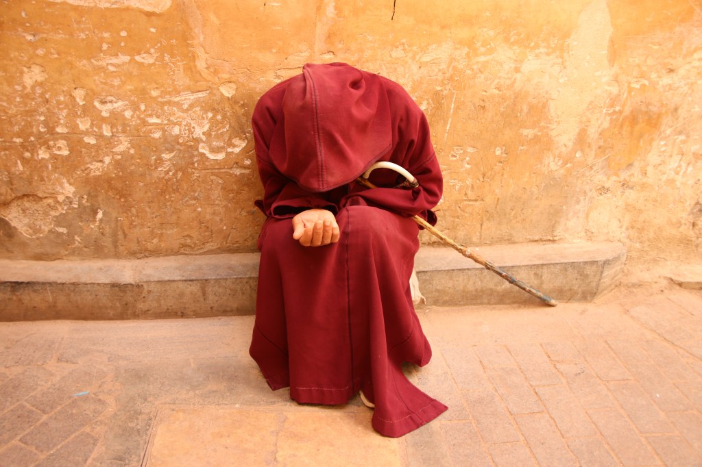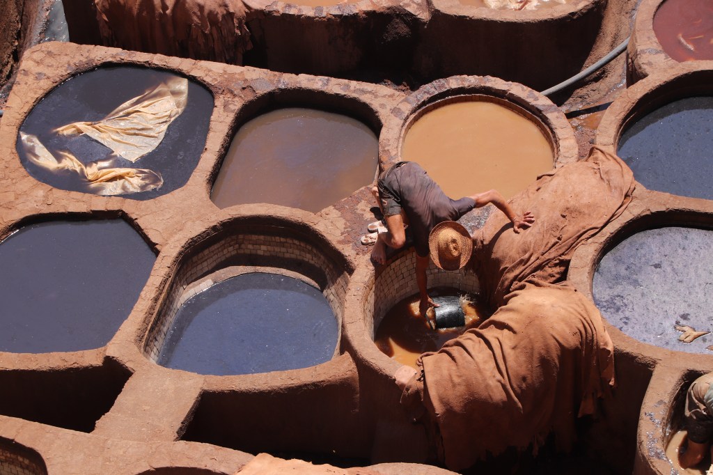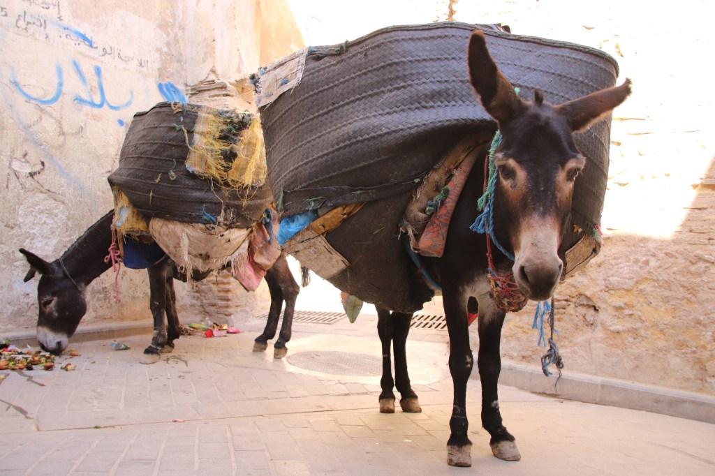 L’emozione più grande è lo spettacolo della conceria, da osservare dalla terrazza più alta, con delle foglie di menta sotto al naso a coprire odori sgradevoli, e la curiosità di assistere ad uno dei mestieri più tradizionali, sebbene logoranti, in città. Qui le pelli vengono lavorate a mano, sotto il sole cocente, nel caldo africano del Marocco. I conciatori passano da una vasca all’altra, alcuni protetti da un cappello di paglia, a piedi scalzi, inalando gli odori e respirando per ore i fumi delle tinture nelle vasche concentriche. Ci siamo incuriositi ancora tra mercati di tappeti, tra bancarelle di ottone, tra stradine dai profumi intensi di spezie, frastornati dai rumori che piano piano si intensificano nel cuore del giorno. I ciuchi passano spesso tra le vie strette, carichi di sacchi di spazzatura o merci. Dobbiamo sempre stringerci ai lati per dare la precedenza al loro transito. Anche qui non mancano i gatti. Sono i benvenuti anche nelle moschee, perché considerati puliti, a differenza dei cani, sempre banditi. Noi non possiamo entrare nelle moschee, ingresso vietato ai non musulmani. Mangiamo con un panino, in una piccola piazza tra ortofrutta, macellai, pollame stipato in gabbie, senza badare agli standard igienici a cui siamo abituati, attenti solo alla cottura della carne, assaggiando sapori che non fossero tajin o cous cous. Per soli 2 dirham è un ottimo pranzo.