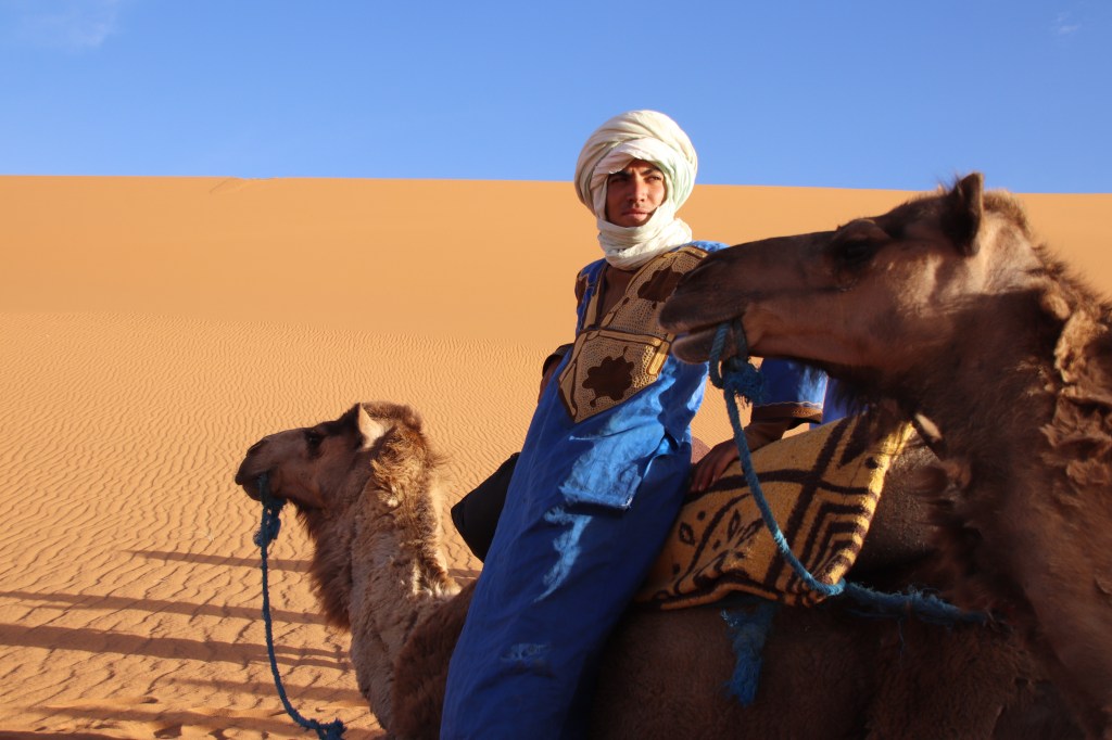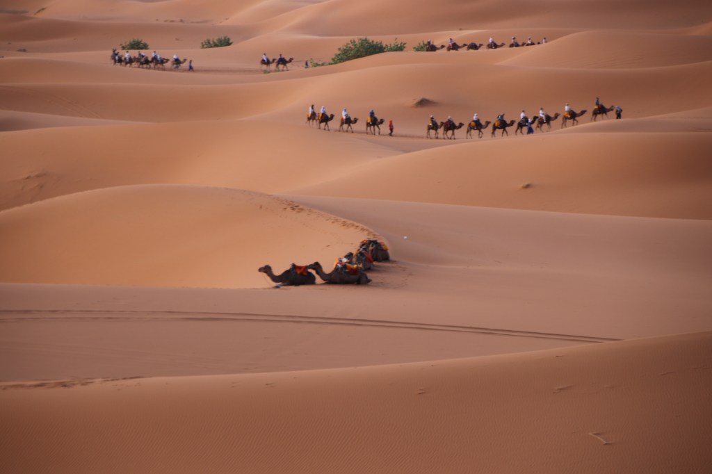 Il paesaggio si fa sempre più spoglio e roccioso, dai colori infuocati al tramonto. Ricorda i panorami dell’Arizona da tutt’altra parte del mondo. In tarda serata arriviamo al riad nelle Gole dello Ziz, location nel nulla di un paesaggio arido. Wi-Fi assente; ogni tanto non dispiace sentirsi disconnessi. L’indomani procediamo in direzione Sahara, sulla via delle kasbah. Sostiamo a Meski, antica oasi ormai prosciugata, ma dai palmeti giganti. Proseguiamo verso Merzouga, un tempo punto di sosta di carovane, ora è il luogo di arrivo dei turisti che visitano il deserto sabbioso, nelle immediate vicinanze delle dune dell’Erg Chebbi, uno dei due gruppi di dune di sabbia formati dal vento nel Sahara marocchino. Le dune raggiungono un’altezza di 150 metri e sono disseminate in un’area di 22 Km da Nord a sud e di 5–10 km da Est a Ovest. Il centro abitato più vicino è Erfoud, dove compriamo dell’acqua ghiacciata prima di addentrarci nel deserto. Ancora troppo caldo, quindi abbiamo il tempo per ballare al ritmo di percussioni dei berberi neri, emozionandoci sulle note dei tamburi dal Marocco, dal Senegal e dall’Etiopia. Diamo 100 dirham di mancia alla comunità ospitante su consiglio della nostra guida. Ogni spettacolo presuppone una mancia. Ma le emozioni hanno un valore molto più prezioso. Due jeep ci portano davanti al mare di sabbia dove i beduini stanno radunando cammelli e dromedari in attesa della classica escursione turistica nel deserto.
