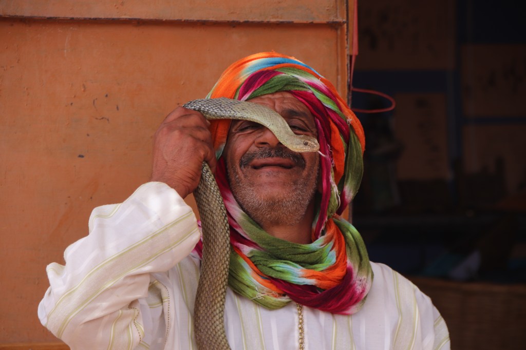 MARRAKESH – Giornata interamente dedicata alla visita della “città rossa”, così detta tra le città imperiali del Marocco. Già dalla sera precedente ci dà l’impressione di essere agitata, affollata e rumorosa, più delle altre tre, sebbene con una identità tutta sua, dove tra le molteplici l’arte della vendita regna sovrana. Vediamo i maggiori punti di interesse: la medina, la madrasa (ingresso 20 dirham a persona), il palazzo Bahia (70 dirham a persona), la moschea solo da fuori (ingresso vietato ai non musulmani in Marocco, fatta eccezione per la moschea di Casablanca, unica visitabile al prezzo di 130 dirham). Torniamo alla caotica, emblematica Jamaa El Fna, per vedere ora gli incantatori di serpenti sotto il sole cocente. Poi è la volta del souk, il mercato dell’artigianato, dei tappeti, delle stoffe, delle babucce, dei quadri e dei ninnoli, di tutto un po’ per acquistare i souvenir. Il tramonto lo vediamo sopra i tetti delle case ammassate e decadenti di Marrakesh, sulla terrazza di un ristorante tipico dove due suonatori vestiti di bianco e del fes, il cappello rosso con pennacchio nero, intonano canzoni marocchine al ritmo di chitarra e tamburo. Il ristorante La Terrasse di Ben Youssef mette in tavola un ultimo tajin.