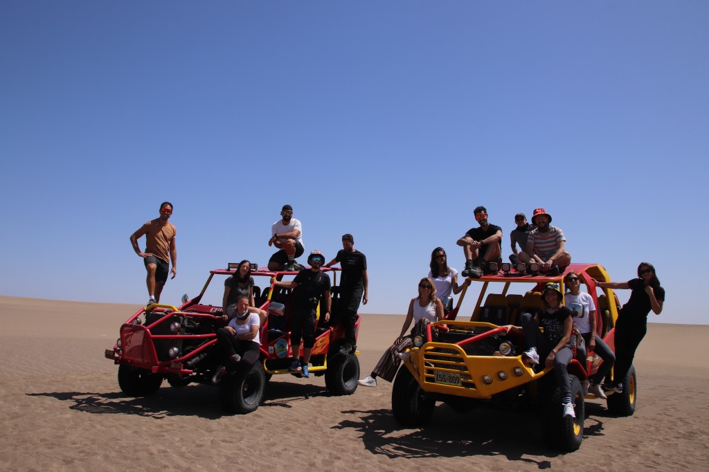Partiamo per un lungo tragitto in pulmino, con sosta a Pisco, patria dell’omonimo liquore. Pranziamo con ceviche. La sera la trascorriamo a Paracas e facciamo un giro sul lungomare al tramonto. L’indomani le isole Ballestas rimangono un’aspettativa incompleta per il meteo burrascoso che impedisce l’uscita in barca. Dalla costa sembra tutto calmo, eppure la tempesta al di là dell’orizzonte implica il divieto della capitaneria di porto all’uscita delle imbarcazioni turistiche. Tuttavia, al porto ci fanno visita alcuni pellicani in cerca di cibo dai pescatori. Ci accontentiamo di scattare qualche foto, immortalandone il grande becco mai sazio di cibo. Improvvisiamo allora una degustazione di vino in tarda mattinata. Il Pisco è il liquore tipico del luogo e lo si ottiene con acquavite ricavata dalla distillazione di vino bianco e rosato e servito, nella versione cocktail denominata pisco sour, servito con albume d’uovo, ghiaccio e lime. Oltre al Pisco, sono molti i vini buoni e fruttati da assaggiare in questa zona. Quindi tutti allegri si dimentica l’inconveniente. Proseguiamo verso Huachachina, villaggio situato in prossimità della città di Ica, attorno ad un lago oggi artificiale che ricorda un’antica oasi, popolare destinazione per dune buggy e sandboarding. Il viaggio in van è un susseguirsi di paesaggi aridi, durare per ore ed ore; spettacolo dal finestrino. Difatti quella del deserto peruviano è una delle zone più aride della terra per estensione. Il panorama è spoglio, sui colori bianco e ocra della sabbia. A tratti si vedono tempeste impedire di riconoscere sagome o guardare lontano all’orizzonte. Arrivati alla meta ci aspetta un giro in jeep sulle dune e le tavole in discesa sulla sabbia. Il sandboarding è un’attività divertente e non rischiosa (si fa da sdraiati sulla tavola, veramente alla portata di tutti, è come uno scivolo per i piccoli).