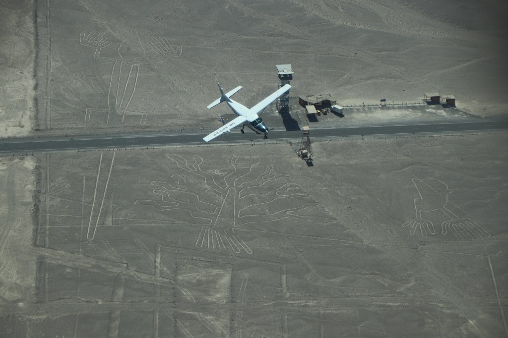 Il volo è facoltativo. Di 14 lo facciamo in 8, me compresa, e sono l’unica a sentirsi male (che figura… la coordinatrice!). Racconto questo solo per dire che ne stra-vale la pena! Anche se sapete di esser deboli di stomaco vale la pena volare. Io ho vomitato all’atterraggio, educatamente nel sacchettino di plastica che forniscono sempre (in quanto cosa piuttosto frequente). Magari non fare colazione se si sospetta di soffrire il vuoto e il mal d’aria. Le linee sono uno spettacolo dall’alto! Si vede un percorso di circa 12 linee, accuratamente spiegato dal co-pilota che parla nel microfono per le nostre cuffie, in primis a coprire il forte rumore del motore e dell’elica. Gli aerei sono piccoli con posti da 6 passeggeri, più pilota e co-pilota. Sfrecciano a bassa quota virando vertiginosamente a destra e sinistra, per permettere di vedere la linea da entrambe le angolazioni. L’aeroporto Maria Reiche, dedicato alla ricercatrice tedesca che dedicò gran parte della sua vita allo studio e alla salvaguardia delle misteriose linee, è colmo di visitatori. Ideale volare la mattina presto. Il volo costa sui 100 dollari a persona ed è possibile farsi fare il timbro sul passaporto. Dopo il volo torniamo in hotel. Con gli altri del gruppo andiamo ai mirador (punti panoramici), per vedere, tutti, le linee. Solo dai mirador a terra ci si rende davvero conto della grandezza di questi capolavori. Compriamo i biglietti per due mirador in cui vedere 3 linee ciascuno. Nel primo saliamo dall’alto di una piattaforma in ferro di una quindicina di metri al lato di una strada nel deserto poco trafficata se non da mezzi pesanti. Nel secondo facciamo un percorso a piedi su una collinetta.