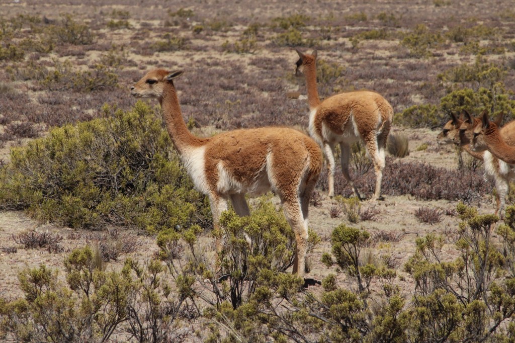 Conosciamo il nostro corrispondente e iniziamo un nuovo viaggio in un nuovo pulmino. I dintorni di Arequipa mostrano paesaggi non ancora scoperti, fuori dal via vai cittadino e sempre più vicini ad una natura spoglia di folta vegetazione, eppure spettacolare di montagne e vulcani. Saliamo progressivamente di quota fino al Passo Patapampa, dove l’altitudine incomincia a farsi sentire provocando, come solito, lieve mal di testa. Le foglie di coca sono un ottimo rimedio naturale. Sebbene l’utilizzo di questa erba sia spesso associato all’elaborato chimico della droga e agli aspetti illegali del suo commercio, la coca in foglie è costantemente masticata dai peruviani, sia nelle grandi città, che a valle, e soprattutto nella regione andina e nei dintorni del Titicaca. La sua efficacia la si percepisce subito come anestetico di qualsiasi malanno, e persino del classico mal di testa dovuto alla quota. Altro modo per adattarsi è prendere il tutto con tranquillità, lasciando che il corpo si abitui pian piano alla mancanza di ossigeno intorno ai 5000 metri. Mai dimenticarsi di bere molto. Percorriamo in van strade sterrate e serpentine, dalle altezze vertiginose e senza alcuna protezione laterale; un classico in Perù. Incontriamo finalmente molti camelidi nel loro habitat naturale, dopo quelli addomesticati nelle Plaza de Armas al guinzaglio di signore abbigliate in indumenti tradizionali che chiedono soles in cambio di una foto (spettacolo scenografico, ma triste). Nella regione del Colca sono frequenti i camelidi sudamericani tra cui i lama dalle orecchie a banana e il muso allungato, e gli alpaca dal pelo folto e una strana espressione che ricorda un sorriso. Raramente si vedono anche gli incroci, che assomigliano a lama di statura un po’ ridotta e dal pelo più folto. Corrono libere le vigogne, generalmente in branchi di 5 o 10 esemplari, nelle praterie ai piedi degli altipiani. Il guanaco non lo abbiamo avvistato. Si tratta dell’ultima tra le 4 specie di camelidi del Sud America, eppure molto raro nel Perù.