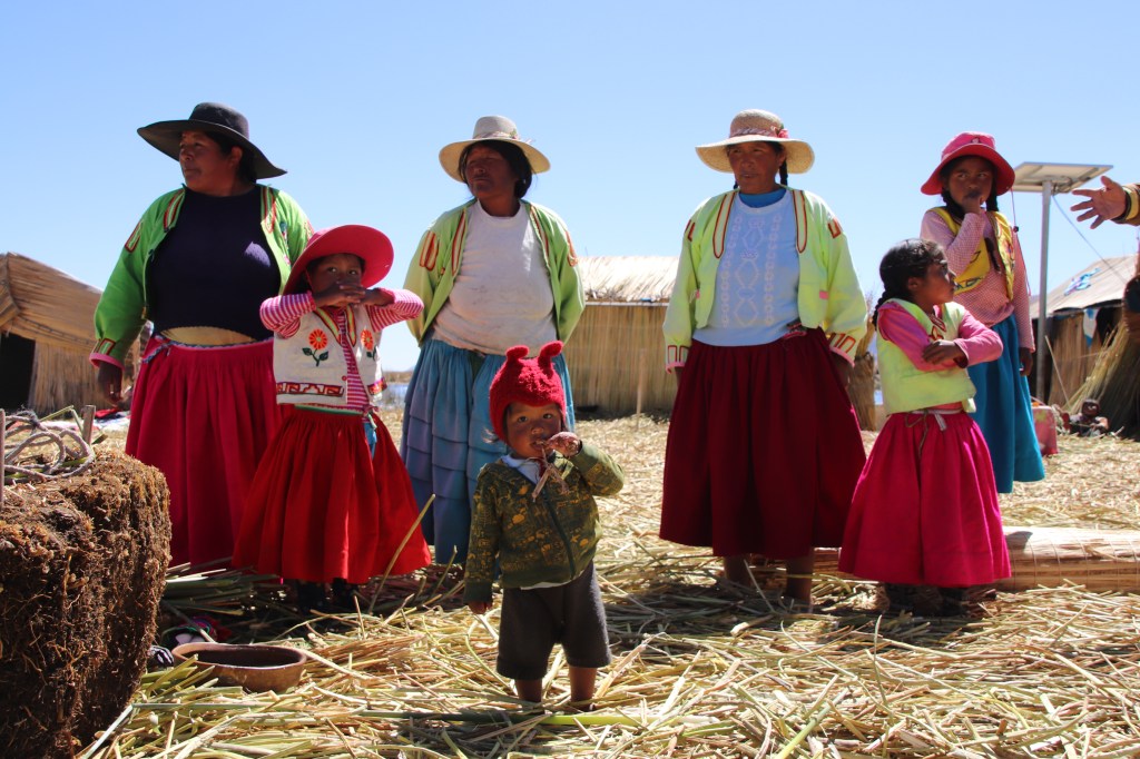 Da Puno un traghetto naviga sulle acque calme del Titicaca, azzurre da cui spunta di tanto in tanto vegetazione fine e alta. Si tratta del lago navigabile più alto al mondo, fino a raggiungere in poche ore di navigazione, le isole galleggianti del popolo Uros, costruite con le lunghe e resistenti foglie di Totora, una pianta che cresce spontanea sull’acqua dolce, che se tagliata al suo interno si mangia e si beve, se essiccata la si usa invece per costruire le isole, le case, le imbarcazioni, tutto. Le isole possono resistere fino a 35 anni. Non si percepisce il dondolio. Anzi si è ben saldi al suolo. Eppure è un prodotto umano. Ogni isola ha un rappresentante e su di essa abitano varie famiglie in capanne. La gente delle isole galleggianti si nutre di pesca,, tra tutto la trota del lago, di Totora, che all’interno ha acqua e succo, e cacciano la Choca (fulica andina), un uccello simile ad un’anatra in grado di zampettare sull’acqua per il suo curioso modo di nuotare, e purificano l’acqua del lago, oppure la bevono direttamente e la usano per pulire e cucinare. Al nostro arrivo hanno prontamente allestito un piccolo mercato, mostrando fieri i prodotti di artigianato fatti a mano dalle danne che lavorano il cucito: cuscini, tovaglie, sciarpe e coperte dai ricami tradizionali e coloratissimi come la trilogia andina (il serpente, il puma e il condor), i mesi dell’anno e i giorni della settimana ciascuno rappresentato da un bene della terra, attorno al Pachatata (il sole). I bambini vengono a salutare i gringos, curiosi e allegri. Approfittiamo per fare un giro sulla barca a forma di banana (per 10/S a persona). Entriamo in 14 sulla barca, più il capo del villaggio e una bambina. A un certo punto possiamo anche stenderci al sole, che è veramente forte e piacevole nelle giornate di inverno, ma secche e limpide di nuvole in questa zona del Perù. Gli Uros ci salutano con un canto locale, e noi ricambiamo con una canzone italiana, poi sbracciandosi dalla loro isola finché il nostro traghetto non si allontana.