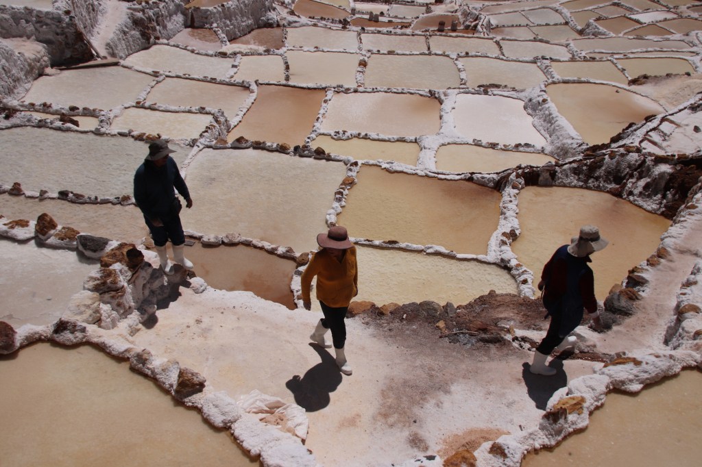 Dedichiamo questa giornata alla visita della Valle Sacra degli Inca. Ci accolgono terrazzamenti sconfinati ai piedi di antichi templi, oggi nei pressi di villaggi in cui si incontrano piccole botteghe, persone con cappelli a sombrero in velluto, di forme variabili (che belli i cappelli in Perù!), artigiani e intessitori che ci spiegano la lavorazione della lana pregiata e soffice dell’alpaca, e le molteplici tecniche per la sua colorazione, esclusivamente con metodi naturali, privi di additivi chimici (quanti acquisti in Perù! Per l’inverno siamo apposto: poncho, maglioni, sciarpe e coperte). Persino il rossetto per le donne lo si fa sacrificando una coccinella. Proseguiamo per le Saline di Maras. 4000 vasche, ognuna di proprietà di una famiglia del posto. Il sole di mezzogiorno acceca sul bianco della salineras. A Moray un altro spettacolo: i terrazzamenti circolari. Sembrano piccoli dall’alto, ma quando vi si cammina al loro interno ci si sente foglie d’erba in confronto. Qui gli inca, abili contadini, coltivavano cereali, frumento e tutti i doni di Madre Terra. L’ultima tappa della valle è il villaggio di Ollantaytambo. Saliamo sulla collina, fino al tempio. Dietro le montagne sappiamo c’è Machu Picchu. Ma non si intravede, ancora.