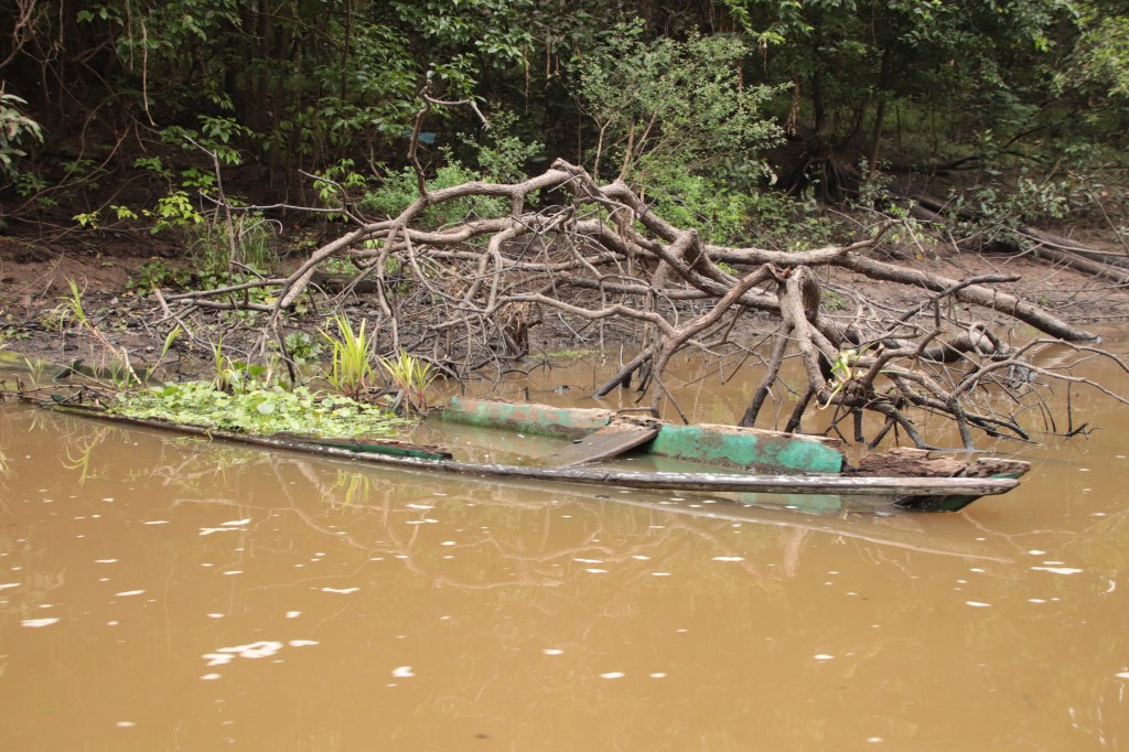 Iquitos è l’unica località dotata di aeroporto nella regione amazzonica peruviana, punto di accesso alla foresta. La città è viva e rumorosa di motorini con cassone che trafficano le strade non asfaltate e sembrano sciami di api quando scatta il verde di un semaforo. Come tutte le città peruviane ha una Plaza de Armas e un mercato in cui si vendono verdura, frutta, carne e pesce di fiume. Il porto – niente a che vedere con l’immagine del porto che ci salta subito alla mente – è un luogo sulla riva del fiume con imbarcazioni in legno e qualche bancarella flottante di snack, acqua, Coca Cola e Inka Cola, costituito di impalcature traballanti e spartane in legno, di dubbia resistenza. Attraversiamo in barca il Rio per raggiungere il remoto lodge. Vediamo i primi uccelli volare da un lato all’altro del fiume. All’arrivo ci debilita la temperatura alta e umida, un po’ a causa della provenienza dai dintorni montani di Cusco e tornati nella capitale d’inverno. Nel Perù gli inverni sono secchi e soleggiati seppur freddi. Stagione particolarmente consigliata per la vista di questo paese, soprattutto per le aree andine, in quanto si riduce il rischio piogge. Mentre nella zona amazzonica siamo invece in estate, perché la regione di Iquitos si colloca nella fascia equatoriale del globo. I tratti somatici delle persone, di statura bassa e pelle scura, con fisico asciutto, ricordano vagamente quelli asiatici, tra i miei viaggi, già visti nelle Filippine. Differenti dalle espressioni e la costituzione di uomini delle Ande incontrati in precedenza in questo viaggio. L’estate corrisponde alla cosiddetta stagione bassa, quando le acque del fiume si ritirano e nella regione “inondabile” (in cui si trova il nostro lodge) permette camminamenti e passeggiate all’interno delle radure e delle lagune. Nell’estate peruviana in Amazzonia sarà inverno, che corrisponde alla stagione alta, quella delle piogge, quando si innalza il livello delle acque del fiume e dei suoi affluenti per l’intensità e la frequenza delle piogge. In questa stagione le escursioni vengono fatte esclusivamente in barca. Il colore marrone dell’acqua è dovuto alla decomposizione del legno, tingendola di tannino. Sugli alberi e sulle rive si nota ancora l’altezza raggiunta dall’acqua nei periodi di piena. Molta vegetazione è sommersa e là sotto alla nostra barca c’è un mondo che non conosciamo, offuscato dai colori scuri in superficie.