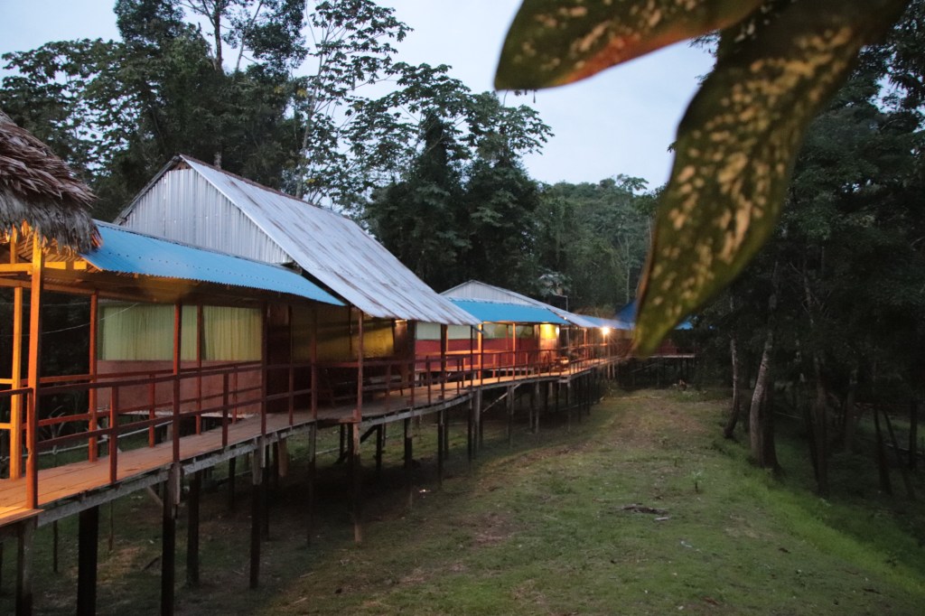 Abbiamo scelto un lodge economico, immerso nella foresta, costruito nei pressi della riva dell’affluente Yanayaku (che in lingua locale significa “guerriero nero”), costituito da una decina di case poggiate su palafitte in legno (apparentemente di dubbia stabilità, traballare al passo di chi attraversa l’impalcatura vicina o entra nell’abitazione), e dai tetti di paglia. In quest’area del Perù la gente venera Yakumama (madre agua). Le stanze non hanno finestre ma una fitta zanzariera ricopre parte delle pareti per evitare gli ingresso anche dei più minuscoli insetti. A volte inevitabile. Alla nostra prima cena c’era una rana in sala da pranzo. Oltre alle abitazioni degli ospiti ed uno per le guide (angeli custodi di ogni visitatore), una cucina, una sala relax con amache e un biliardino, una sala da pranzo. Qualsiasi pacchetto turistico prevede sostanzialmente le stesse attività nella foresta e nel fiume. Il prezzo varia a seconda del lusso che ci si vuole concedere nel pernottamento. L’elettricità è generata dal solare ed è disponibile dalle ore 18:00 alle 21:00 circa. Abbiamo un bagno con una doccia, in questa zona del Perù fredda non è poi così male. Tutti gli alloggiamenti sono in posizioni isolate, spesso in prossimità di un affluente del Rio delle Amazzoni, a cui si accede facilmente con escursioni in barca, per permettere ai visitatori varie esperienze, sempre accompagnati da una guida locale (impensabile e vietato addentrarsi da soli nella foresta, a meno che non si tenti suicidio). Harley è un ragazzo di 22 anni, rivereño, come del resto tutte le guide amazzoniche. E come tutti, conosce gli animali della giungla, ne riconosce il verso, a volte lo sa replicare (che bravo! E io non riesco nemmeno a fischiare…), sa percepire la distanza, e molto prima di noi sa avvistare un animale perfettamente mimetizzato nell’ambiente indicandoci dove si trova. La prima sera è forse l’uscita più spettacolare, un po’ per l’entusiasmo di quelli appena arrivati e un po’ per le sorprese della natura che dovremmo imparare a ringraziare più spesso e trattare con rispetto (alla fine siamo suoi ospiti, se abbandoniamo la presunzione di esserne padroni). Vi racconto l’esperienza della nostra prima uscita. Dopo cena, a piedi dal lodge, muniti di luci sulla testa, pantalone lungo e k-way per coprire il corpo dalle zanzare e stivali per il fango, ci incamminiamo dentro le fronde. I suoni della natura prevalgono su tutto. È un frastuono di cinguettii mai sentiti prima, e gracchiare di rane. Le nostre luci, unico barlume artificiale nel buio della notte, illuminano scorpioni, insetti di vario tipo, ragni, farfalle che dormono, rane colorate dagli occhi rotondi adagiate su foglie ampie, ad esempio la colorata Red spotted frog, un bradipo che arrotolato sul ramo di un albero accenna poi a muoversi timidamente e lentamente (come Valerio quando supera i 4000 metri). Il suo manto è mimetico rispetto ai tronchi degli alberi, ma la sagoma è inconfondibile. Siamo abbastanza vicini al ramo che abbraccia. Notiamo l’espressione sgraziata e primordiale, le tre unghie lunghissime aggrapparsi a rallentatore, ma con efficacia, al ramo. In genere i bradipi stanno alti sugli alberi. Scendono solo una volta a settimana, per defecare. La specie peruviana ha tre unghie. In altre zone ne hanno soltanto due.