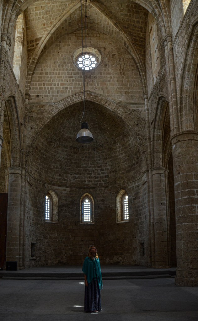 Nicosia racchiude in sé tutta la storia di Cipro e porta le cicatrici di tutte le conseguenze. Sembra di fare due viaggi diversi, nel tempo, e nello spazio. Uno in Grecia, uno in Turchia. Eppure a un passo! Nicosia è protetta da antiche mura veneziane ed è divisa tra la Repubblica di Cipro (parte meridionale) e la Repubblica turca di Cipro (parte settentrionale), non riconosciuta dalla comunità internazionale. Si passa il confine a piedi. Ledra Street è ricca di negozi di firme nella parte greca ed è interrotta da un posto di blocco, un muro con filo spinato e una dogana dove controllano i passaporti a chi entra e esce. La città è protetta da Mura veneziane, costruite nel 1567 dagli ingegneri Ascanio Savorgnano e Francesco Barbaro; avevano 11 bastioni, 2 cancelli pubblici e una porta militare, nonché l’immancabile fossato. Nonostante questo, nel 1570 gli ottomani riuscirono ad occupare la città. Ad oggi, 5 bastioni sono nella parte turca della città e 5 in quella greca. La porta Famagosta, invece, era un tempo utilizzata per conservare munizioni militari fino al dominio inglese, è stata ristrutturata nel 1980 e offre ai turisti uno sguardo all’interno della massiccia fortezza medievale che circonda la città. Le sue sale oggi vengono utilizzate anche per mostre culturali e performance artistiche. Ci dirigiamo dalla piazza subito al Buyuk Han, vuoto di via vai la mattina presto e ricco di gente a pranzo. Questo è un caravanserraglio del Seicento oggi perfettamente ristrutturato con negozi e ristoranti. La moschea Selimiye, in origine la cattedrale cristiano ortodossa di Santa Sophia, in stile gotico, convertita in moschea dopo la conquista ottomana, è oggi il simbolo della città nord. La fusione delle due strutture religiose ha creato un’affascinante costruzione. Per entrare le donne si coprono il capo, le caviglie, e le braccia. C’è così tanto da vedere che prendiamo un trenino turistico per un giro di una mezz’ora, appena fuori dal mercato al coperto, dove si vende arte, quadri dei presidenti turchi e della corona inglese, artigianato, cianfrusaglie, spezie, frutta e verdura.