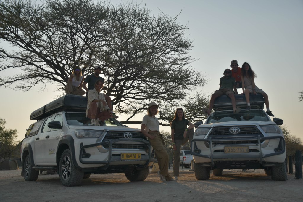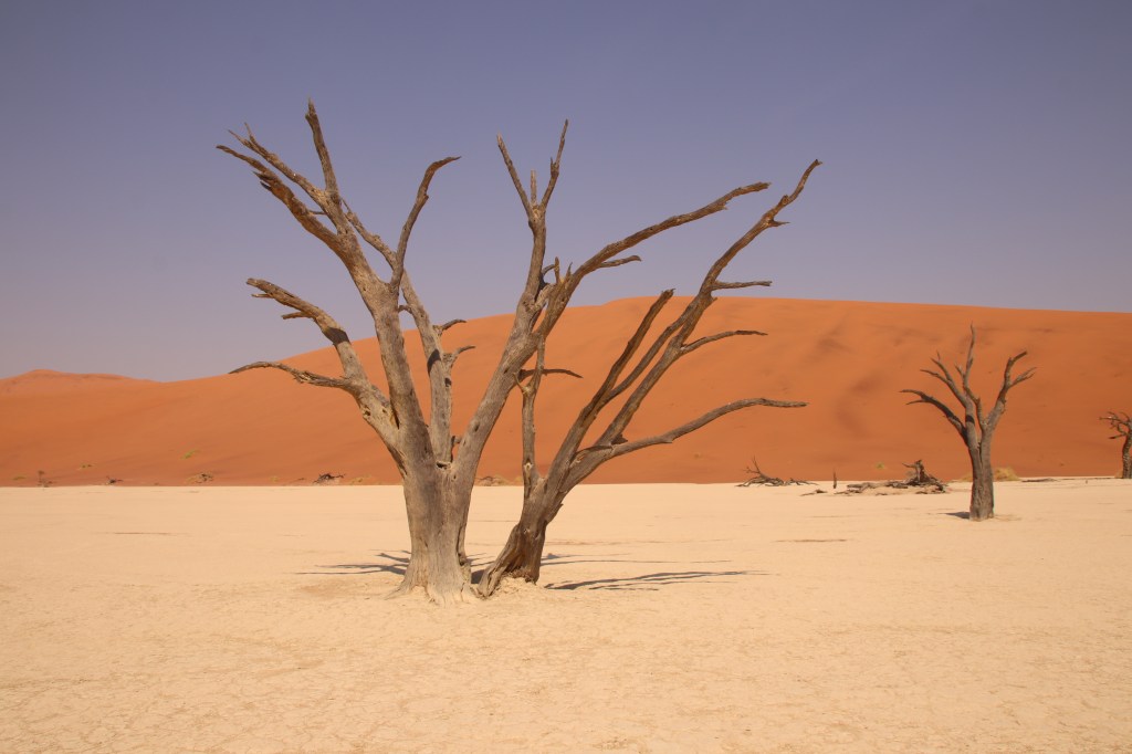 Il Namib è uno dei deserti più grandi del mondo e l’aridità si sente, anche sulla nostra pelle. Usiamo tutti il burro di cacao per le labbra screpolate. Sembriamo protagonisti di un film in cui si è rimasti senz’acqua per giorni. Usiamo tutti le torce per la testa la sera, per cucinare, mangiare e per andare al bagno, e anche per chiudere le tende alle prime luci dell’alba. Usciamo puntuali all’apertura del gate, che coincide e cambia con l’orario del sole. Il sole che sorge lo vediamo dalla Dune 45. Il paesaggio di sabbia rossa si infuoca al passare dei minuti. Ogni passo affonda, ogni sguardo va lontano; a scendere è un attimo e un urlo liberatorio. Proseguiamo verso la Deadvlei. Varchiamo l’entrata con le nostre jeep e continuiamo in autonomia, senza mai scendere sotto i 40 km/h per non rimanere piantanti nella sabbia, senza perderci d’animo quando ci rimaniamo davvero, piantati nella sabbia, ma rimediamo subito, seguendo i tracciati di altri fuoristrada, entusiasti del primo nostro, vero, tratto semi-deserto. Da esperti campeggiatori ci sentiamo pure driver saggi, ora. Arriviamo al parcheggio e dopo un breve cammino si intravedono le acacie ultra secolari, ormai morte. Uno scenario spettacolare: la depressione del pan di colore bianco circondata da una cornice di dune rossastre in un quadro perfetto disegnato dalla natura, sotto la luce cocente e l’aria torrida di mezzogiorno. Il caldo si fa troppo intenso per Big Daddy, l’enorme duna di oltre 300 metri di altezza che si erge ai piedi del pan. Pranziamo al ristorante del camp, ci rilassiamo nella piscinetta e ci godiamo il tramonto, una doccia rigenerante e l’atmosfera del camp, compresa la nostra prima grigliata serale.