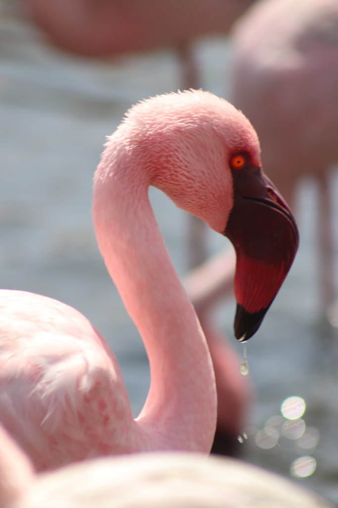 L’indomani partiamo presto e facciamo una fermata al canyon di Sesriem, vigili per schivare i serpenti velenosi namibiani. Invece incontriamo solo scarabei giganti del deserto. Siamo da soli in una gola di roccia arida e possiamo giocare a fare l’eco. In auto, i paesaggi cambiano ogni 2/3 ore e la strada, anche quando il viaggio sembra essere interminabile, non è mai monotona. Avvistiamo le prime zebre. E tanti orici dalle corna lunghe e affusolate. Facciamo ancora uno stop a Solitaire, dove c’è una pompa di benzina, un forno che vende pasticceria abbastanza buona, la ferraglia di auto abbandonate, e tanti, tanti scoiattoli, decisamente poco intimoriti dai visitatori di passaggio. Ci fermiamo per alcune foto all’iconico cartello del Tropico del Capricorno, e poi alla vista del paesaggio, dall’alto del Kuiseb Pass. La nostra meta è l’Oceano Atlantico, la nostra destinazione finale è Walvisbaai. Dopo ore percorse sullo sterrato, arriva la strada asfaltata. Un’atmosfera surreale e apocalittica con il vento a 37 nodi. La sabbia fine e fitta è come una frusta sulla nostra pelle. Grandi camion carichi di merce transitano le strade della seconda città più grande e popolosa della nazione, seconda solo alla capitale. Qui lavorano oltre 100 mila persone. La grande attrazione di questo luogo, oltre Sandwich Harbour che visiteremo il giorno seguente, sono i fenicotteri, bianchi e rosa. Questi pennuti alternano la costante ricerca di cibo al riposo in equilibrio su di una zampa.