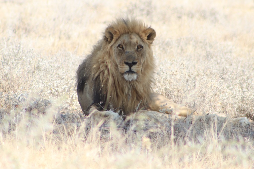 La mattina dopo sembra che abbiamo un problema alla carrozzeria di una delle jeep, quindi ci fermiamo dal primo meccanico che capita di strada, notando che anche lui ha uno scheletro di testa e corna, che tiene come mascotte nell’officina, ma di kudu. Anche noi abbiamo sempre lo scheletro della testa di orice con corna, ancora nel bagagliaio della mia jeep, ormai di consueto l’ultimo carico, dopo gli zaini. Ci porta fortuna. Infatti il problema all’auto non è grave e possiamo ripartire poco dopo, ancora sullo sterrato nella regione del Damaraland, verso l’Etosha National Park. Al gate abbandoniamo però le corna di orice.